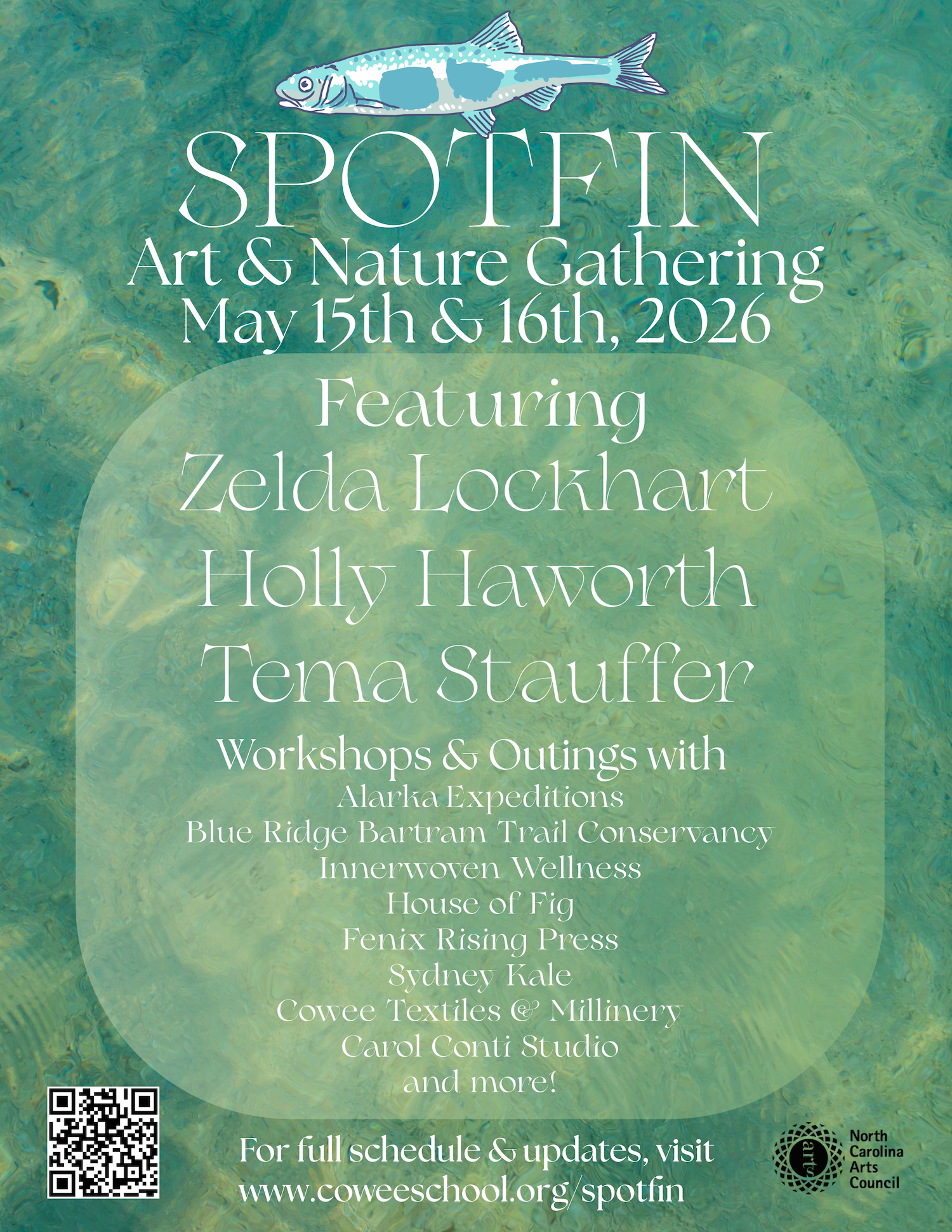 An opening reception for SPOTFIN will take place from 5-7pm on Friday, May 15, 2026 at the CSAHC. This will be accompanied by a series of outings and classes on May 15th and 16th as part of the Spotfin Nature & Art Gathering at Cowee School Arts & Heritage Center. The exhibit runs from May 11th - July 17th. Art purchases from the show can be made through the Cowee Mercantile (a percentage of proceeds goes to CSAHC).